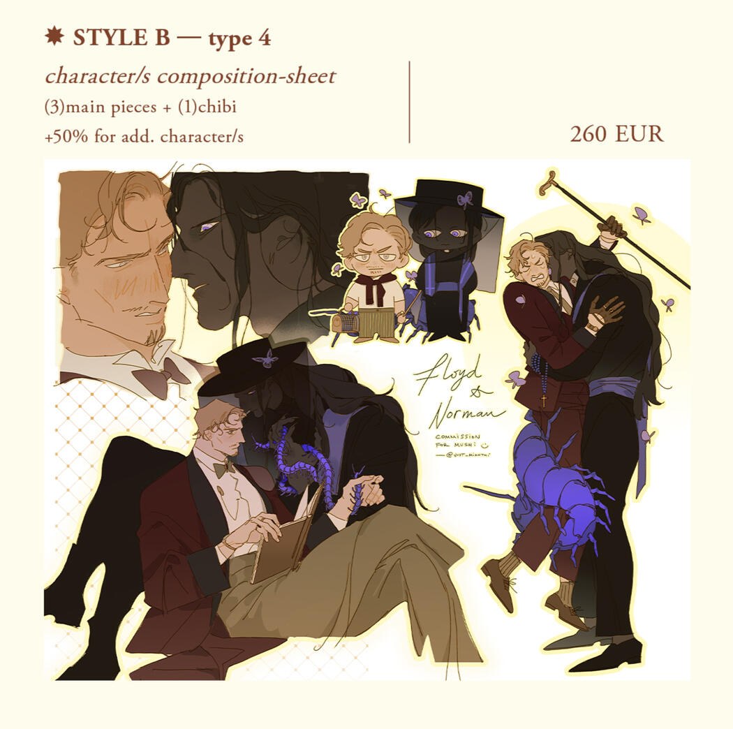 - Feel free to talk with me about your ideas! But please understand that I might decline commission requests which make me feel uncomfortable... (which is rare, but just in case!)- If you are unhappy at any stage of the commission, please kindly let me know! I'm always glad to hear your feedback and hope we can work on a painting that we are both happy with, together.- If you would like to keep your commission as private, please kindly check the private option in the commission form!- Please credit me in case you enjoy the commission and would like to share the commission on social medias :)► My Responsibilities